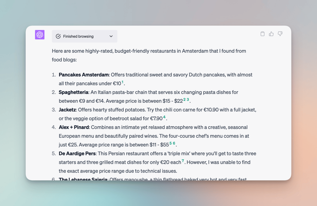 I wanted to test out Web browsing, so I thought about outsourcing one of the tasks I do often when visiting a new city; finding great restaurants.